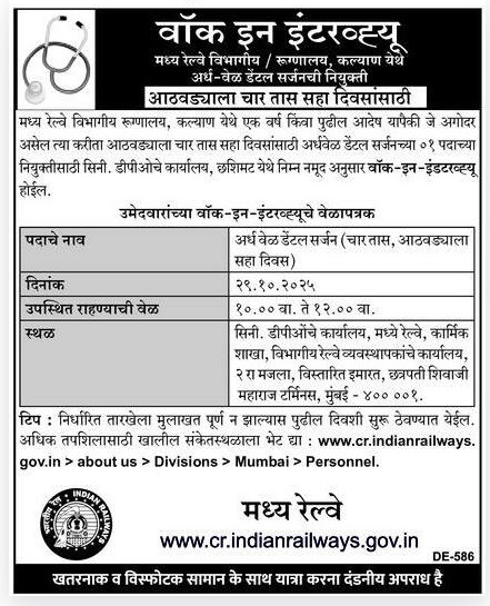 Central Railway Recruitment 2025: Central Railway has released the job notification for 1 Dental Surgeon Job vacancy. The educational qualification for recruitment is Graduate. The interested and eligible candidates can able to apply for the job notification from to 29/10/2025. The selected candidates will be placed in Mumbai. For this notification, Central Railway recruiting the candidates by Direct walkins only. So aspirants are requested to fill the job application form and go to the walkin location on undefined.
