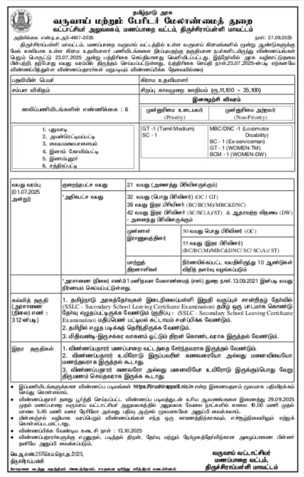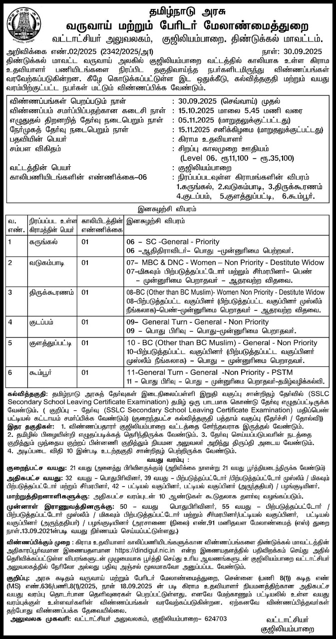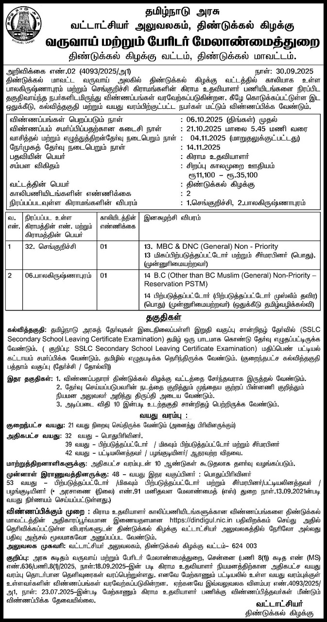 Dindigul Revenue Department Village Assistant Job Notification 2025 Details