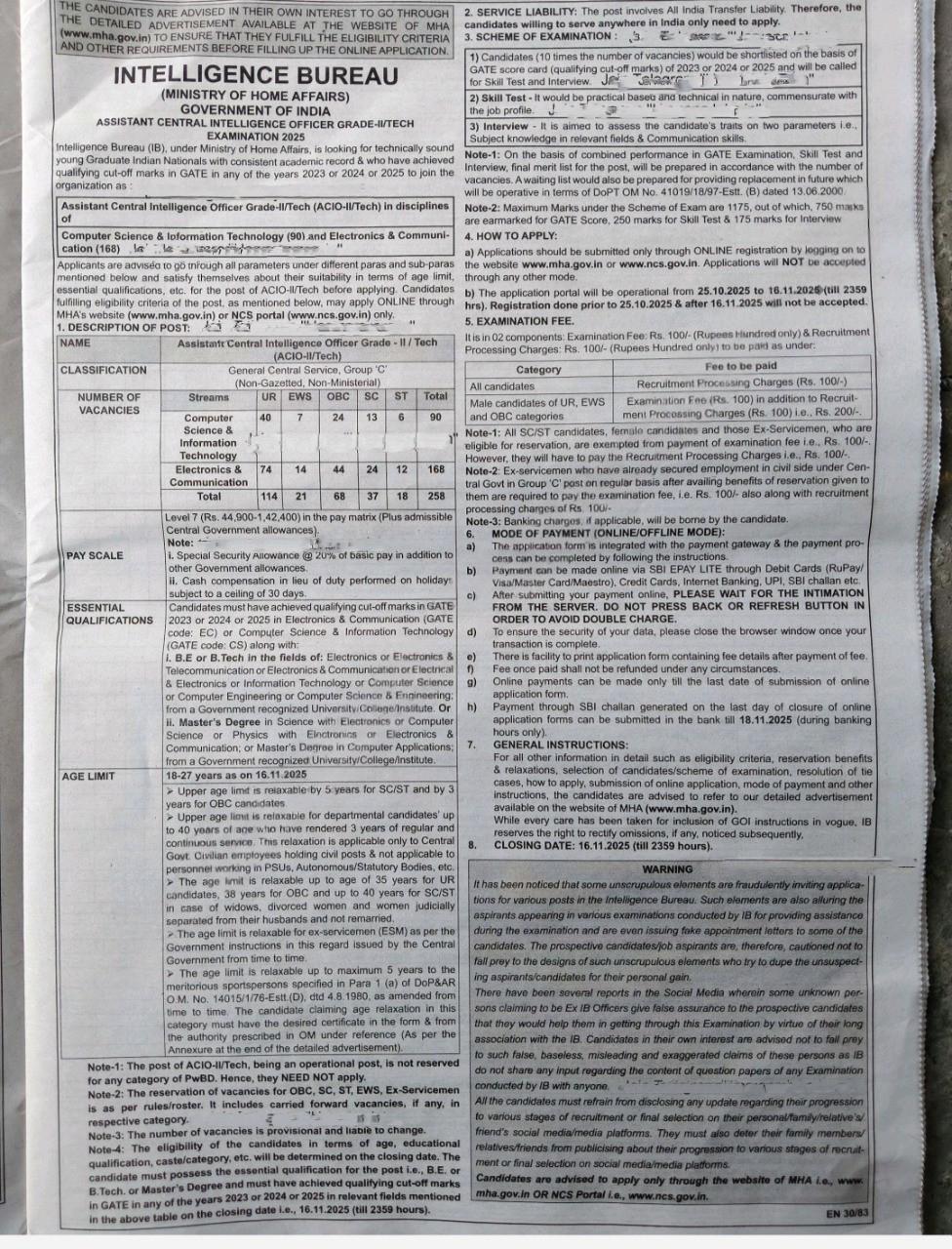 IB Recruitment 2025: Intelligence Bureau (IB ) has released the job notification for 258 Assistant Job vacancies. The educational qualification for recruitment is B.E, B.Tech. The interested and eligible candidates can able to apply for the job notification from 25/10/2025 to 16/11/2025. The selected candidates will be placed in All Over India. For this notification, IB recruiting candidates by online mode only. The IB online application link will be available on official website only. Aspirants are requested to fill the IB online application form 2025 by online. The online application form will be available on the official website only.