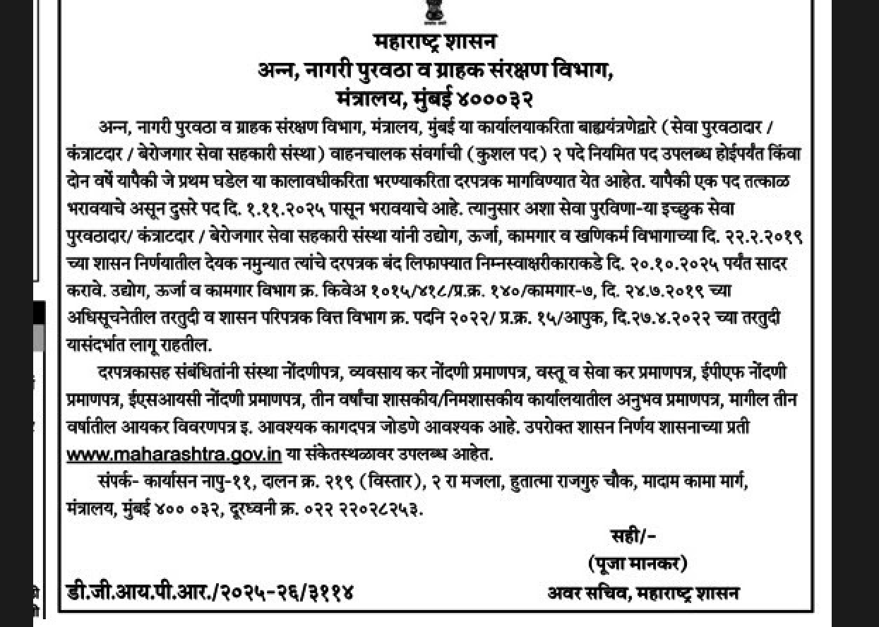 MAHA Food Recruitment 2025: Food, Civil Supplies and Consumer Protection Department, Maharashtra (MAHA Food) has released the job notification for 2 Driver Job vacancies. The educational qualification for recruitment is 10th. The interested and eligible candidates can able to apply for the job notification from 10/10/2025 to 20/10/2025. The selected candidates will be placed in Mumbai. For this notification, MAHA Food recruiting candidates by Offline mode only. The application form will be downloaded from the official website http://mahafood.gov.in. The candidates need to fill the Food, Civil Supplies and Consumer Protection Department, Maharashtra application form and sent it to the organization address. The application form should contain all the necessary documents. Most of the times the job application to be couriered to the notified address. The application received after 20/10/2025 will be invalid.