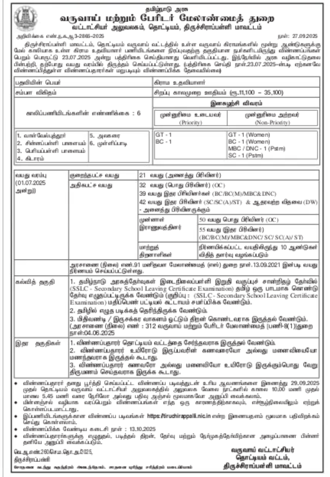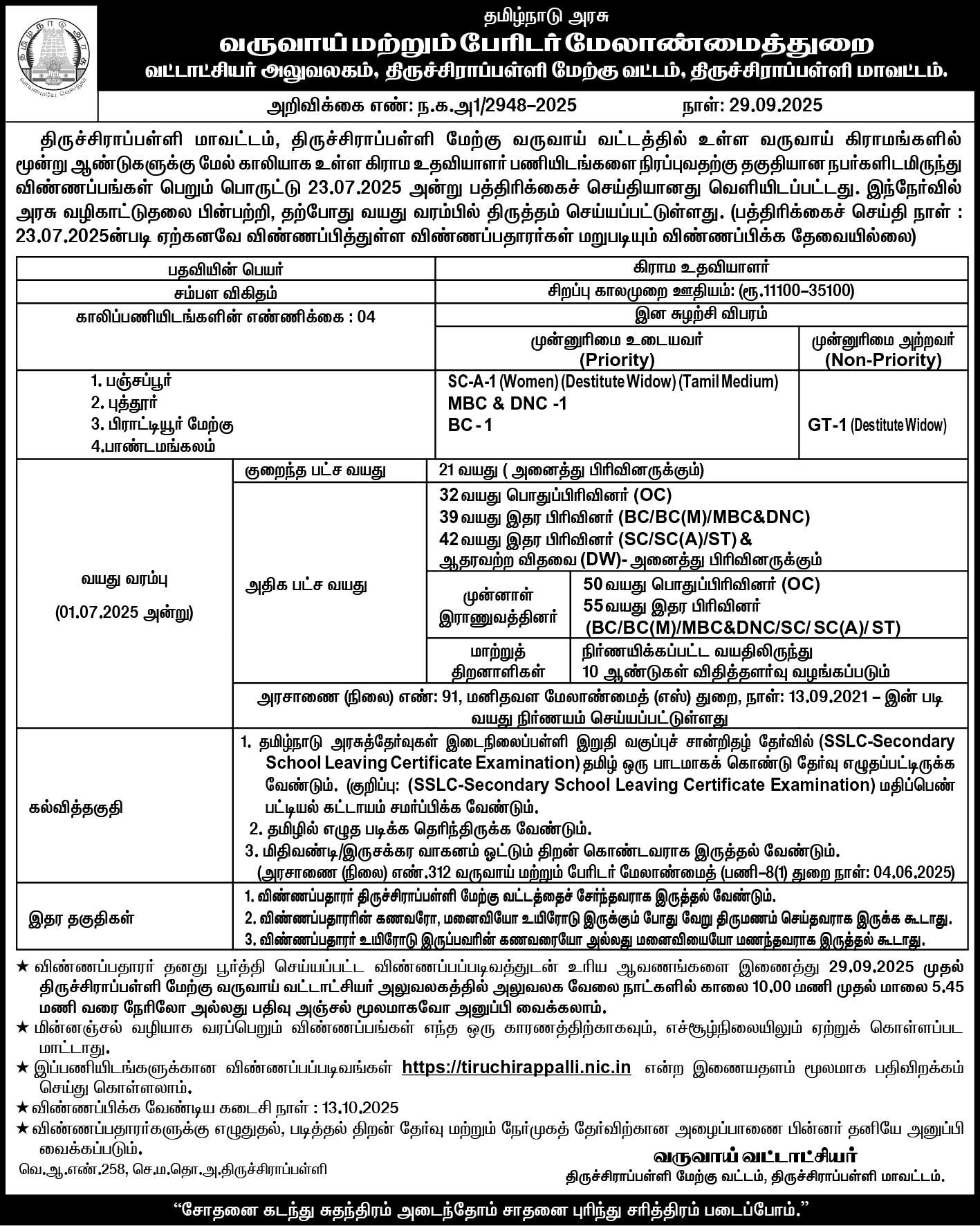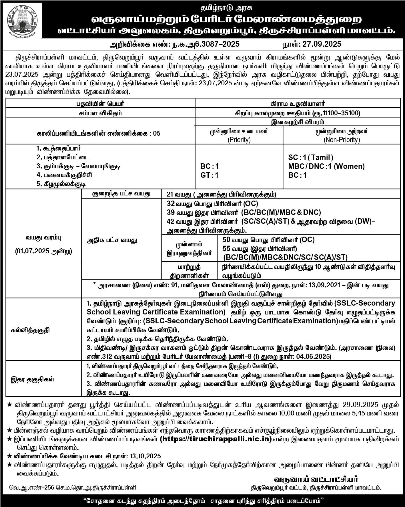Thiruverumbur Taluk Village Assistant 2025 Notification | 5 Posts |