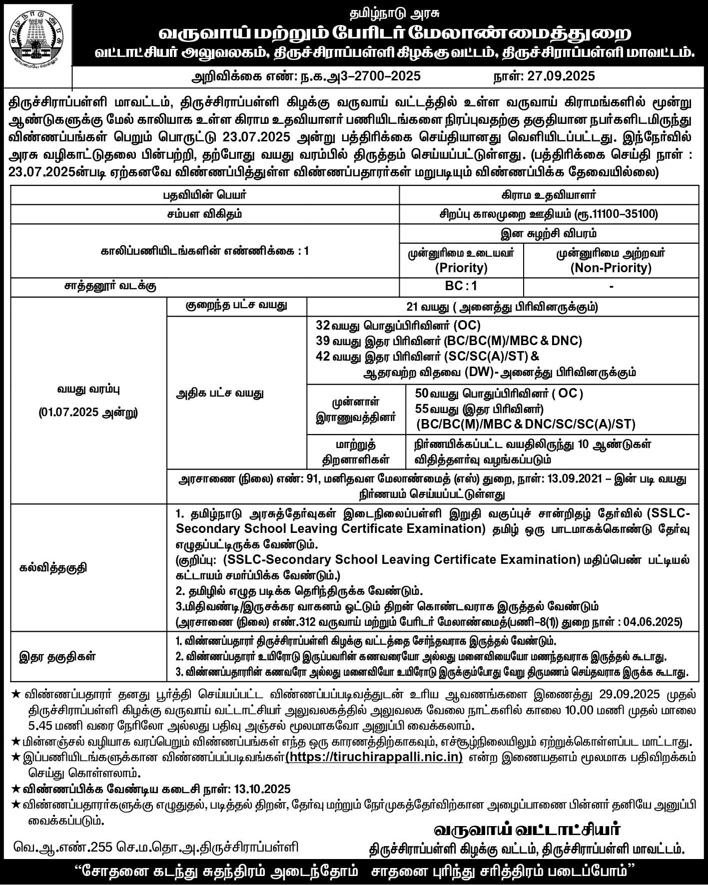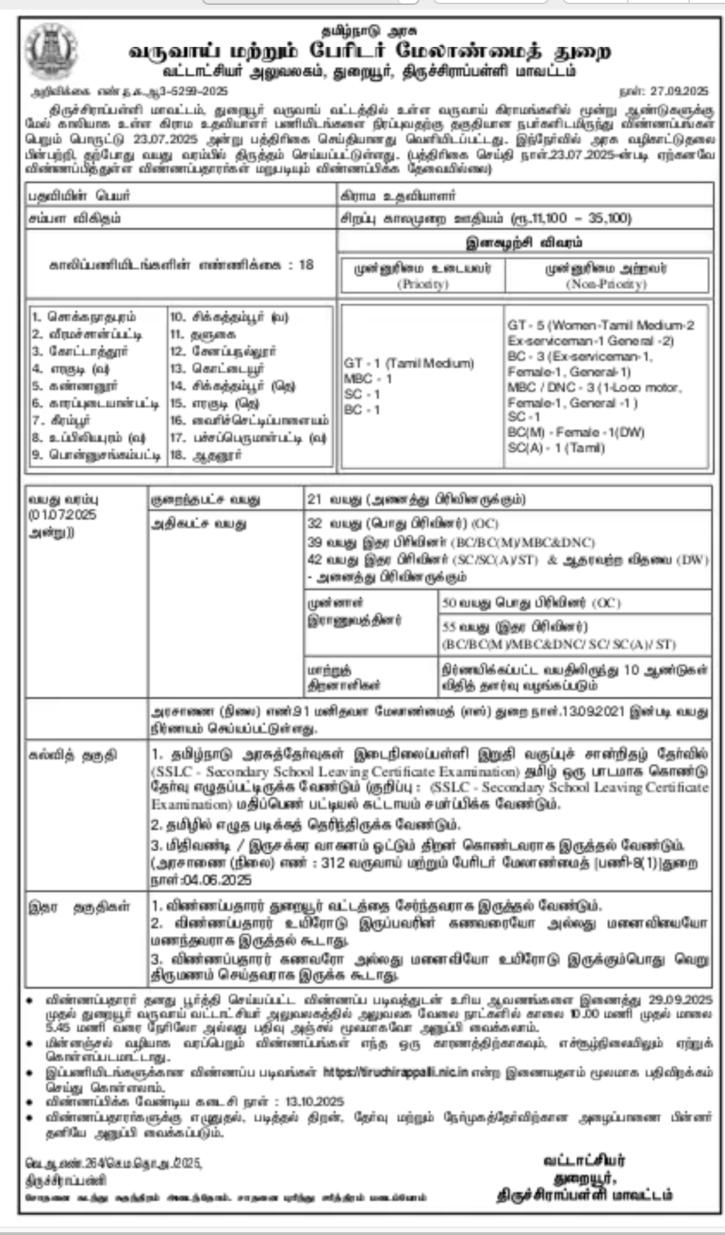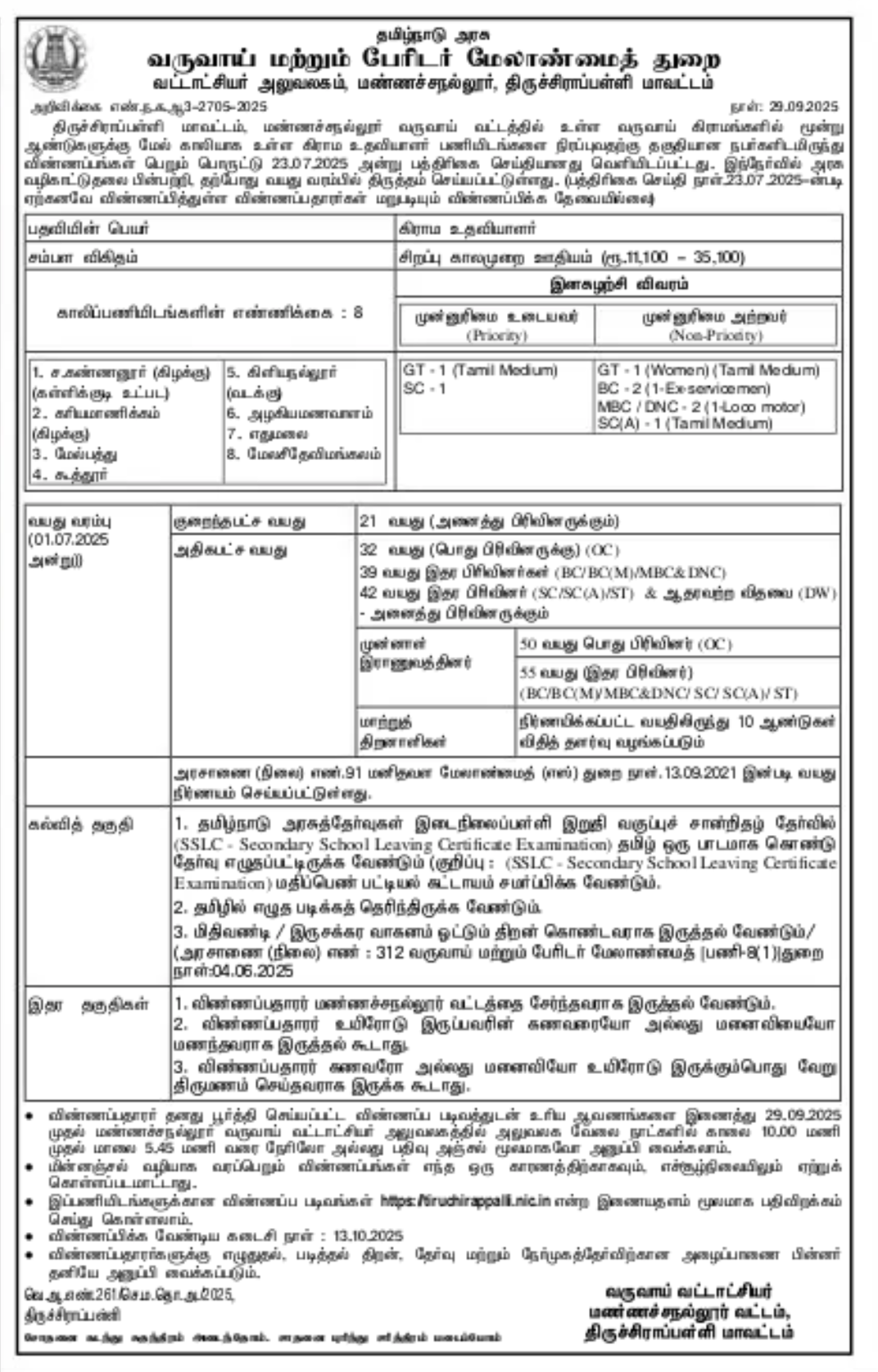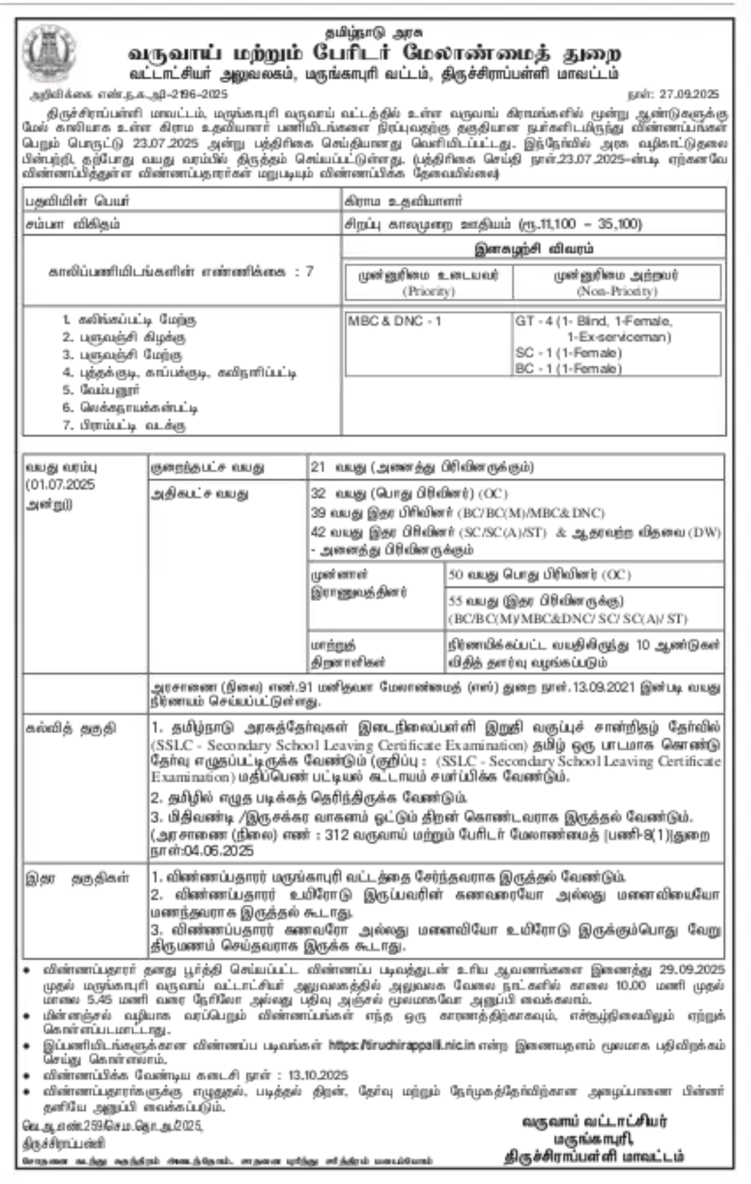 Thiruverumbur Taluk Village Assistant 2025 Notification | 5 Posts |