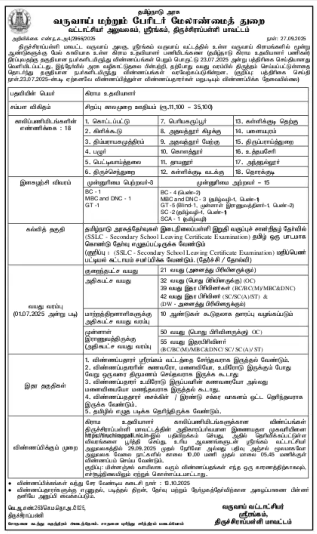 Thiruverumbur Taluk Village Assistant 2025 Notification pdf | |