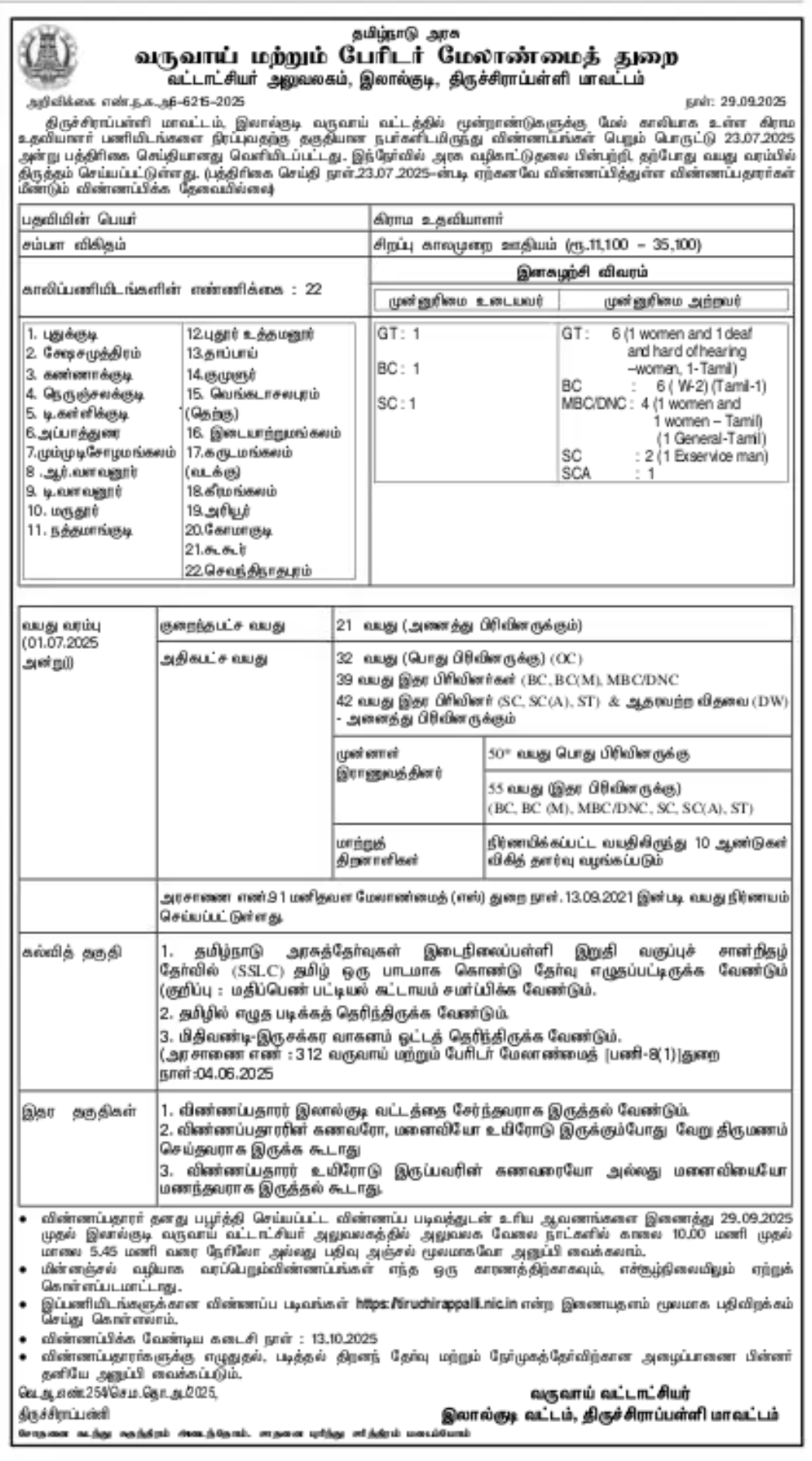 Lalgudi Taluk Village Assistant 2025 Notification | 22 Posts |
