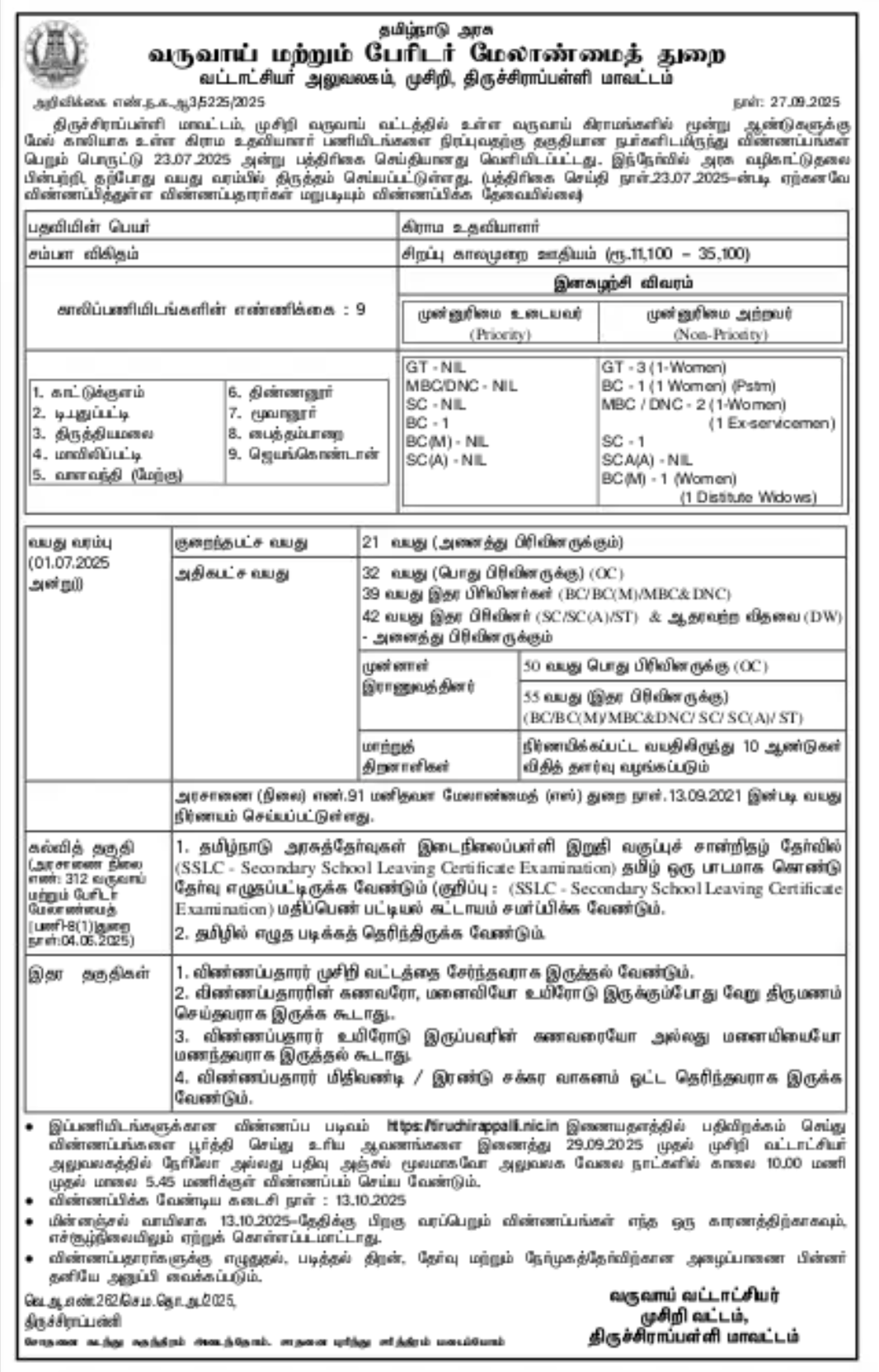 Musiri Taluk Village Assistant 2025 Notification | 9 Posts |